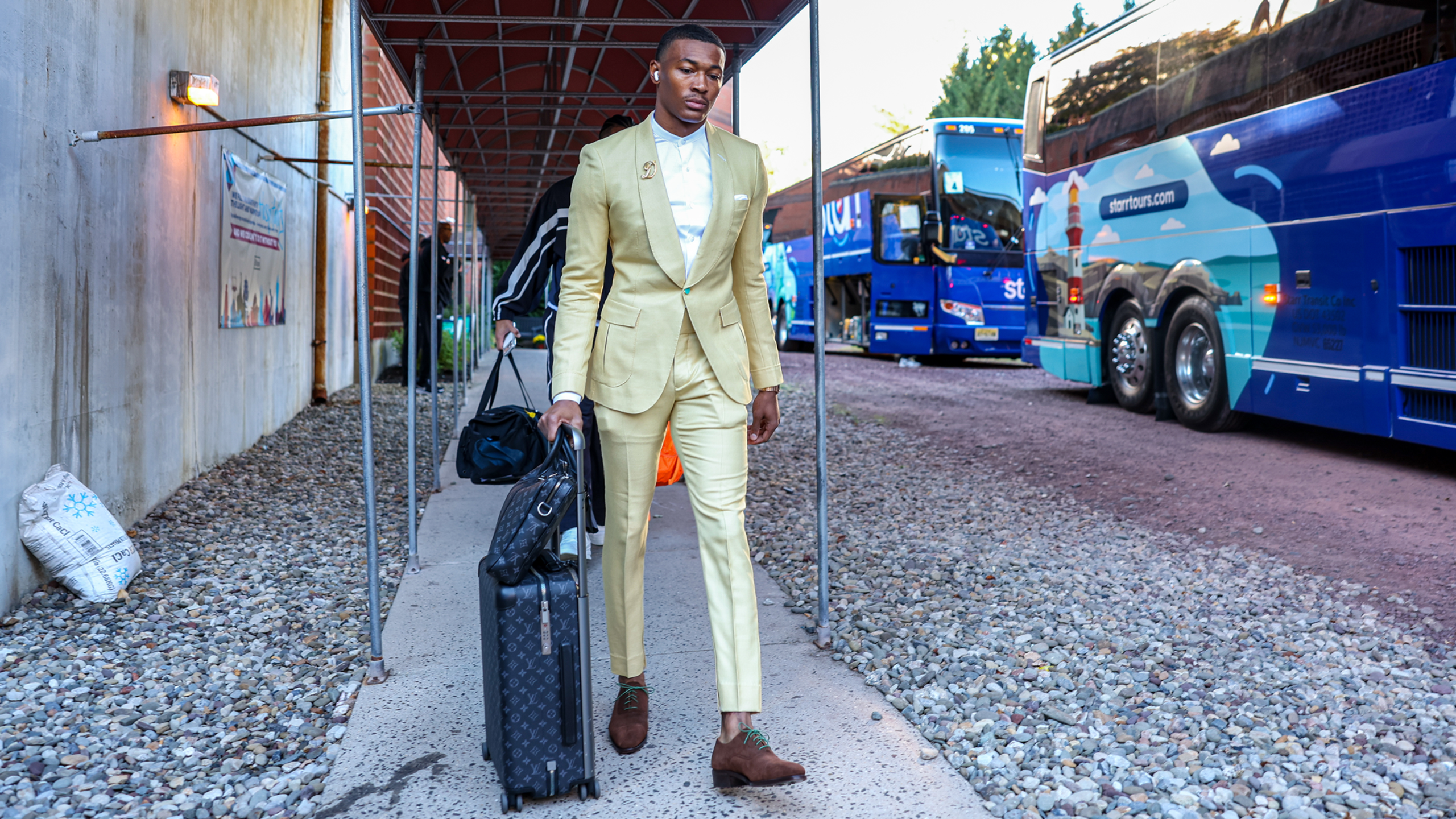 Daniels traditionally rocks Louis Vuitton in his tunnel fits, but this week's switch-up to a green Prada jacket paired with white dress shirt and black tie ahead of a big prime-time game generated his best look of the season, in this panelist's view. It's a good mix of comfort swag and business professional. I love the black accessory pop, from the shoes to the shades to the toiletry bag.